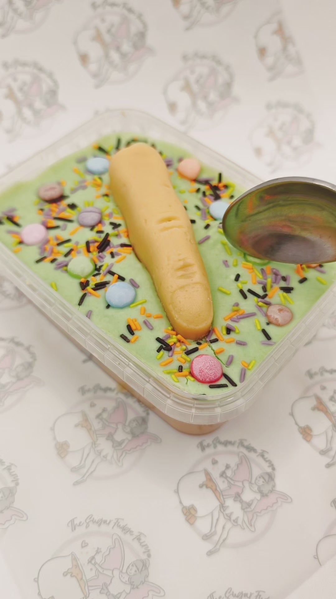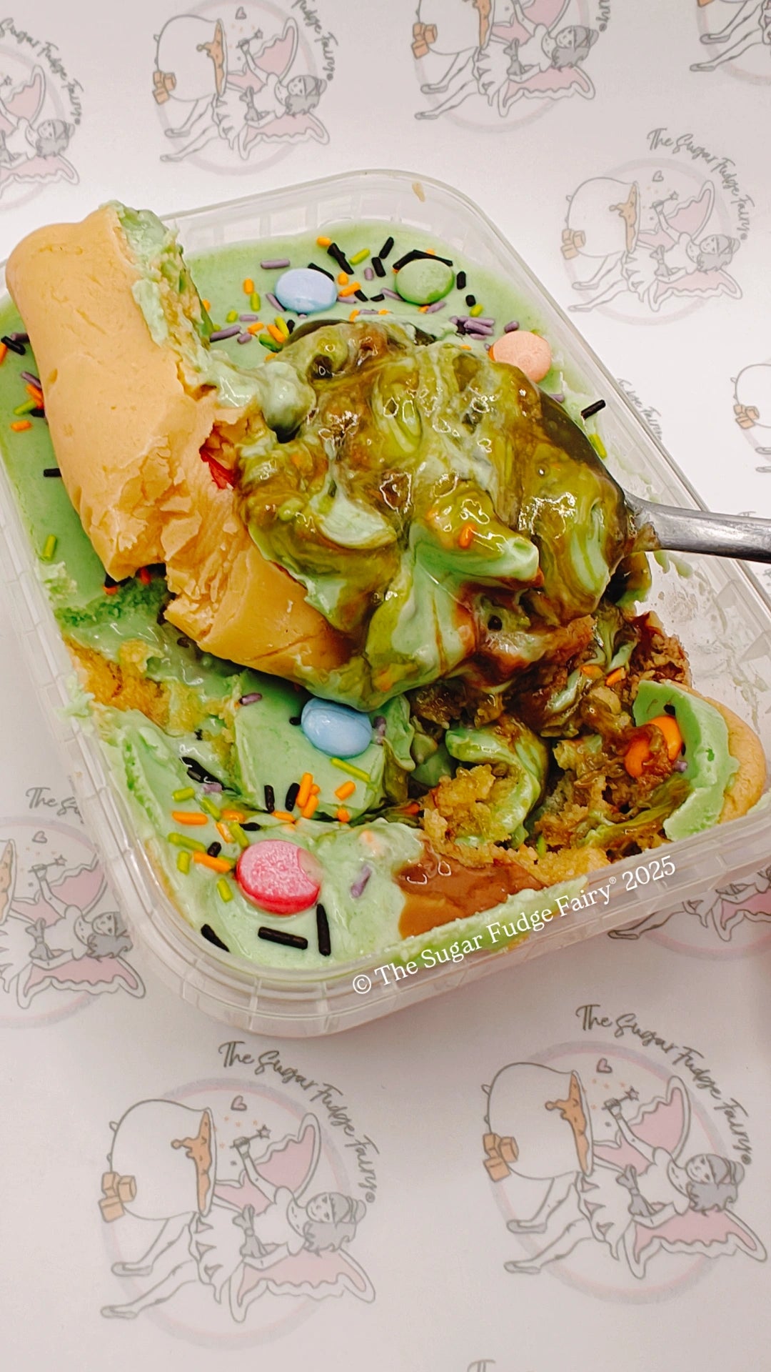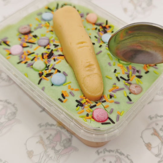 Our delicious cookie dough made in house stuffed with a buttery salted caramel (dyed green to look like slime!) and topped with Belgian white chocolate (also dyed green!), mini chocolate beans, Halloween sprinkles and a whole scary fudge finger!