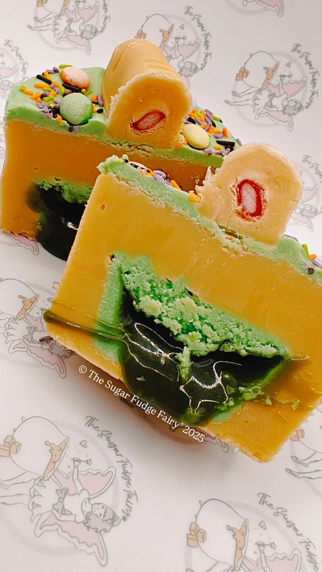 Trick or Treat! Our soft vanilla fudge has a spooky surprise inside it! A (green!) white chocolate cup stuffed with a gooey buttery salted caramel 'slime'! Topped with more (green) white chocolate, mini chocolate beans, Halloween sprinkles and a whole scary fudge finger!